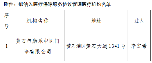 根据《医疗机构医疗保障定点管理暂行办法》(国家医疗保障局令第2号)等文件规定,经自主申报、资料审核、现场评估,黄石市康乐中医门诊有限公司符合基本医疗保障定点协议管理要求,拟纳入我市医疗保障服务协议管理,公示期为2025年10月16日至2025年10月22日(共5个工作日,节假日除外),对以上情况如有异议,请在公示期内及时向黄石港区医疗保障局反映相关情况,联系电话:0714-6280316。