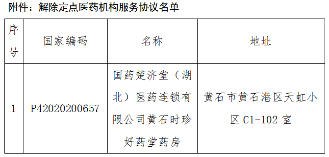 根据《零售药店医疗保障定点管理暂行办法》(国家医疗保障局令第3号)、《湖北省医药机构医疗保障协议管理经办规程》、《湖北省定点零售药店医疗保障服务协议(2025版)》等文件规定,经医药机构自主申请,从2025年12月12日起,解除国药楚济堂(湖北)医药连锁有限公司黄石时珍好药堂药房定点医药机构服务协议。