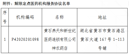 根据《零售药店医疗保障定点管理暂行办法》(国家医疗保障局令第3号)、《湖北省医药机构医疗保障协议管理经办规程》、《湖北省定点零售药店医疗保障服务协议(2025版)》等文件规定,经医药机构自主申请,从2025年12月25日起,解除黄石养天和新世纪医药连锁有限公司神农药店定点医药机构服务协议。