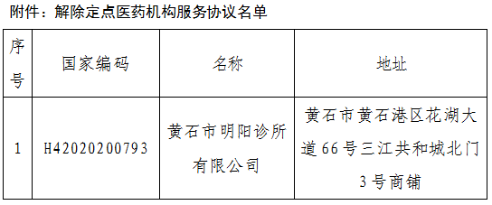根据《医疗机构医疗保障定点管理暂行办法》(国家医疗保障局令第2号)、《湖北省医药机构医疗保障协议管理经办规程》、《湖北省基本医疗保障定点医疗机构服务协议(2025版)》等文件规定,因黄石市明阳诊所有限公司在医疗保障基金使用过程中,存在违反医保协议约定的行为,影响了医疗保障基金的安全与规范使用。经研究,决定自2026年1月28日起,解除黄石市明阳诊所有限公司定点医药机构服务协议。