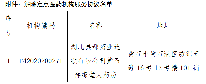 根据《零售药店医疗保障定点管理暂行办法》(国家医疗保障局令第3号)、《湖北省医药机构医疗保障协议管理经办规程》、《湖北省定点零售药店医疗保障服务协议(2025版)》等文件规定,经机构自主申请,从2026年1月8日起,解除湖北吴都药业连锁有限公司黄石祥缘堂大药房定点零售药店医保服务协议。