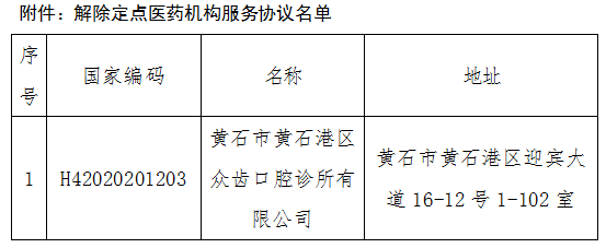 根据《医疗机构医疗保障定点管理暂行办法》(国家医疗保障局令第2号)、《湖北省医药机构医疗保障协议管理经办规程》、《湖北省基本医疗保障定点医疗机构服务协议(2025版)》等文件规定,经医药机构自主申请,从2026年3月4日起,解除黄石市黄石港区众齿口腔诊所有限公司定点医药机构服务协议。