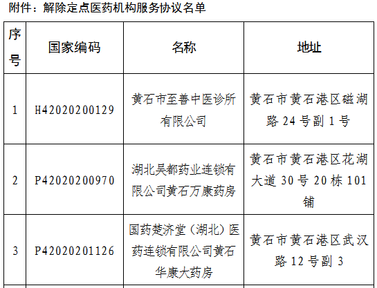 根据《医疗机构医疗保障定点管理暂行办法》(国家医疗保障局令第2号)、《零售药店医疗保障定点管理暂行办法》(国家医疗保障局令第3号)、《湖北省医药机构医疗保障协议管理经办规程》、《湖北省基本医疗保障定点医疗机构服务协议(2025版)》、《湖北省定点零售药店医疗保障服务协议(2025版)》等文件规定,经医药机构自主申请,从2026年3月31日起,解除黄石市至善中医诊所有限公司等5家定点医药机构服务协议。