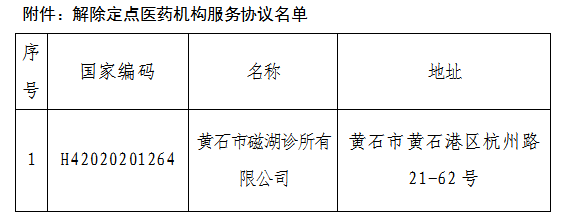 根据《医疗机构医疗保障定点管理暂行办法》(国家医疗保障局令第2号)、《湖北省医药机构医疗保障协议管理经办规程》、《湖北省基本医疗保障定点医疗机构服务协议(2025版)》等文件规定,因黄石市磁湖诊所有限公司在医疗保障基金使用过程中,存在违反医保协议约定的行为,影响了医疗保障基金的安全与规范使用。经研究,决定自2026年4月17日起,解除黄石市磁湖诊所有限公司定点医疗机构服务协议。特此公示(名单详见附件)。
