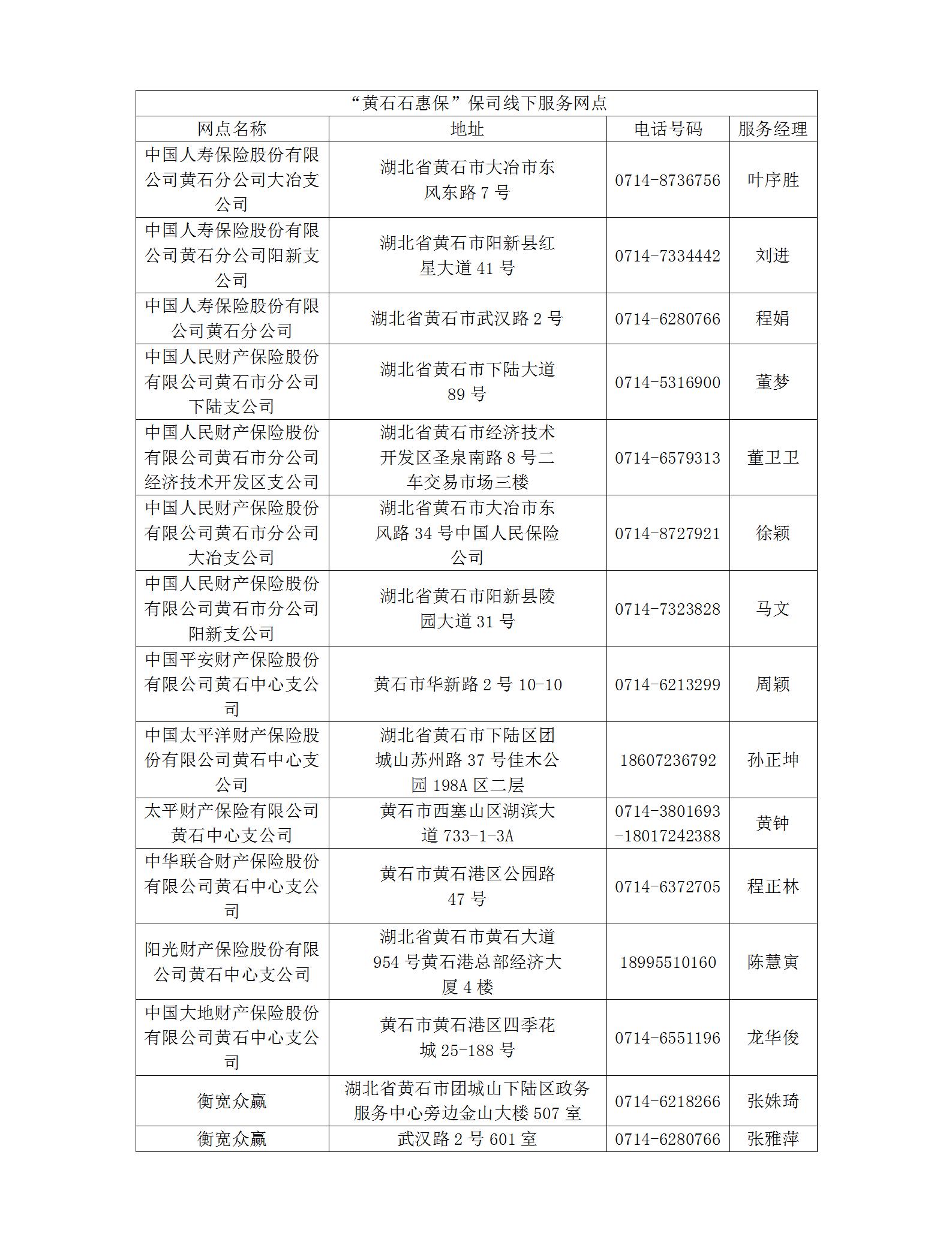 黄石“石惠保”在黄石市各县(市,区)共设有16处服务网点,受理参保人员线上或线下咨询及理赔结算。参保人员申请享受“石惠保”待遇,可在“黄石石惠保”微信公众号一键申请或各县(市,区)服务网点一站式结算。