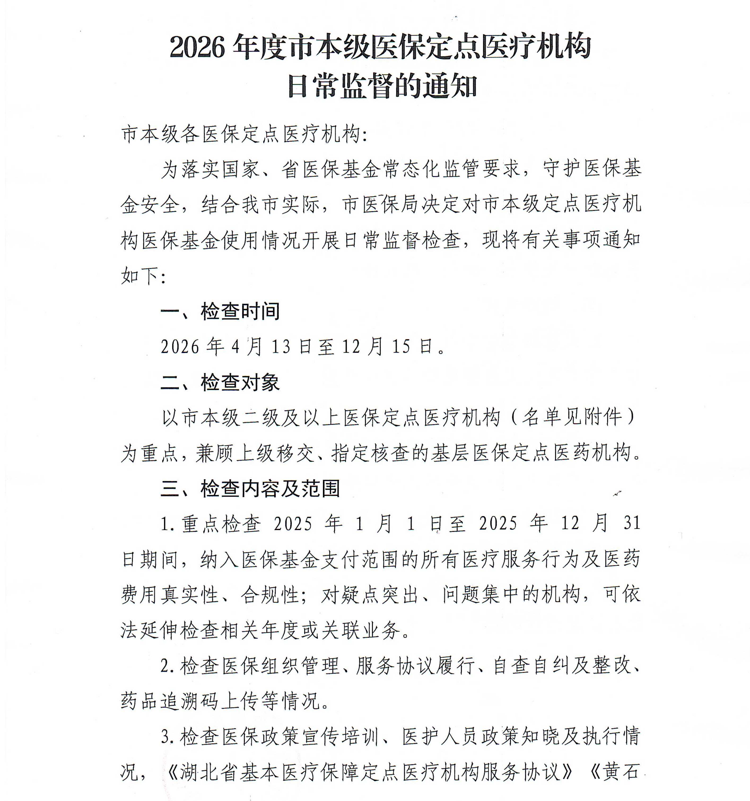 2026年度市本级医保定点医疗机构日常监督的通知